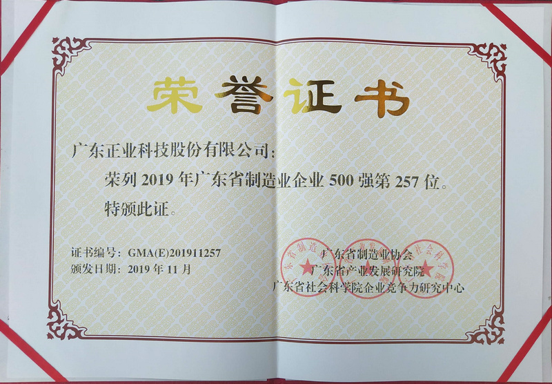 正業科技榮列“2019年廣東制造業企業500強”榜單,這充分彰顯了公司在制造領域深耕細作,所表現出來的卓越綜合實力和強大市場競爭力。