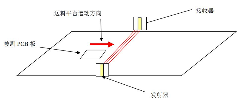 利用非接觸式影像測(cè)量技術(shù),通過(guò)一對(duì)高精度激光位移傳感器,包括一個(gè)接收裝置和一個(gè)發(fā)射裝置,當(dāng)覆銅板或PCB板經(jīng)過(guò)這對(duì)位移傳感器時(shí),有板的地方將會(huì)阻擋發(fā)射裝置發(fā)射的信號(hào),從而在接收裝置上無(wú)法響應(yīng)相應(yīng)位置的信號(hào)。