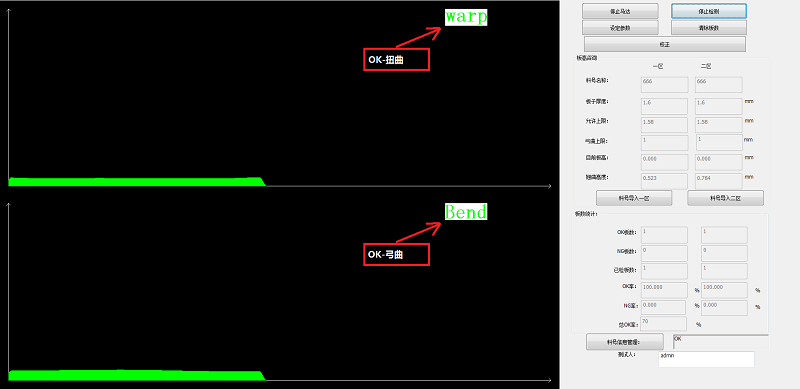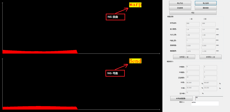 通過(guò)位置的信息可以得到PCB板的板厚曲線圖,通過(guò)特定軟件算法和翹曲度定義,計(jì)算出板翹曲度,并根據(jù)設(shè)定判斷條件得出OK和NG板。