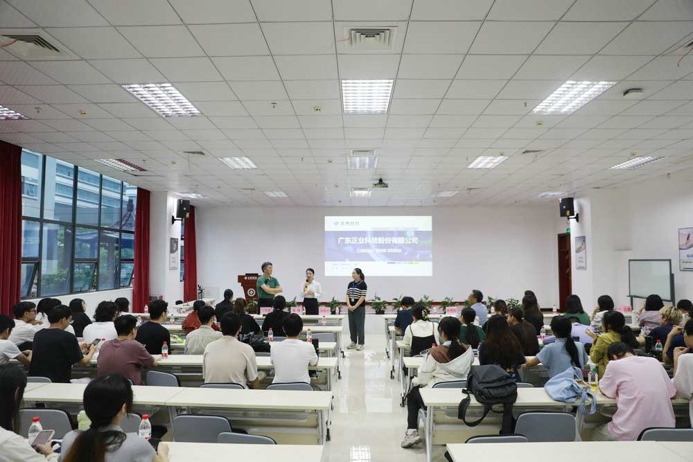 東莞理工學院師生一行率先參觀了正業(yè)科技展廳,總裁辦滕娟主任為大家詳細介紹了正業(yè)科技發(fā)展歷程、行業(yè)布局、重點產品以及創(chuàng)新技術等情況。隨后,大家來到生產車間,了解到了正業(yè)科技設備的先進性及生產工藝的創(chuàng)新性。