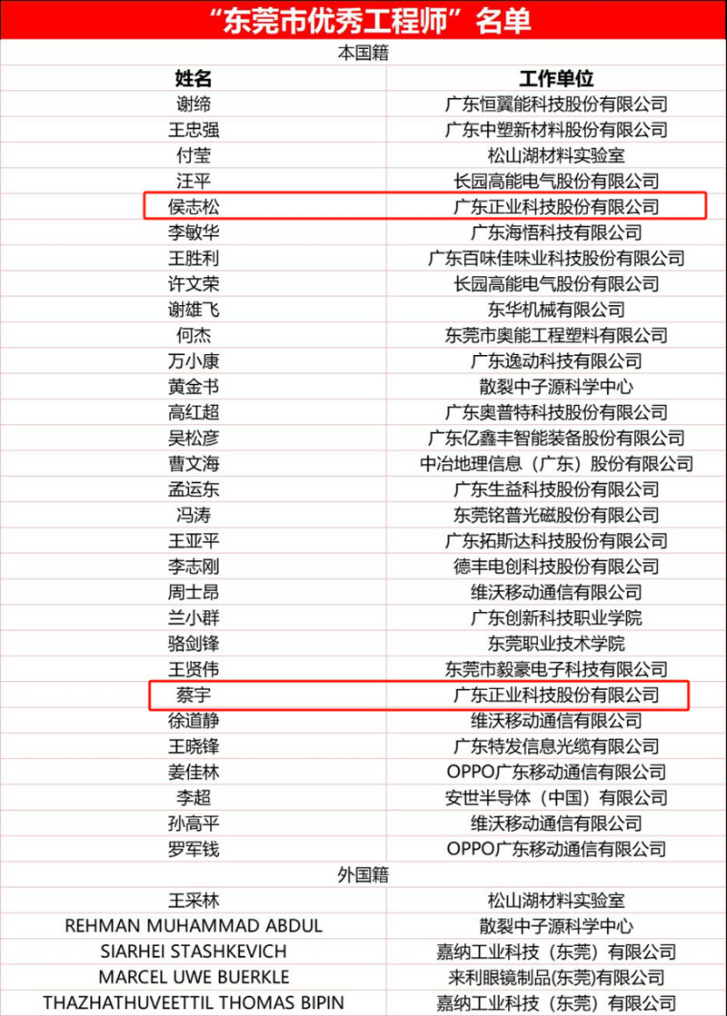 正業科技蔡宇、侯志松被評為2024年“東莞市優秀工程師”