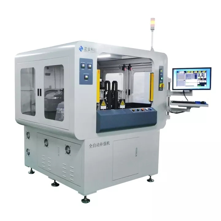 自動(dòng)補(bǔ)強(qiáng)機(jī)是正業(yè)科技研發(fā)的一款適應(yīng)于對柔性線路板貼合補(bǔ)強(qiáng)材料的技術(shù)成果,也是本次參觀活動(dòng)的明星產(chǎn)品之一。該款設(shè)備實(shí)現(xiàn)全自動(dòng)上下板,自動(dòng)放隔紙,節(jié)省人工成本,可一鍵倒入,換料號(hào)只需10分鐘,該款設(shè)備貼合精度高:±50um(高精模式),±75um(高速模式),貼片效率快:2500PCS/H(高精模式),4000PCS/H(高速模式)。