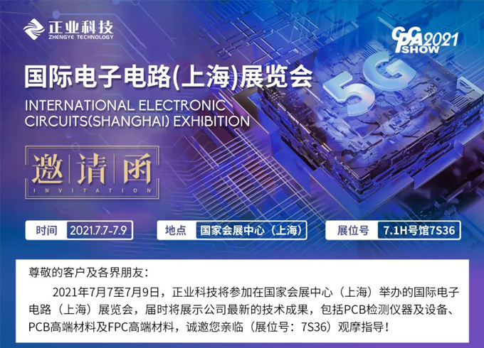 2021年7月7至7月9日,正業科技將參加在國家會展中心(上海)舉辦的國際電子電路(上海)展覽會,屆時將展示公司最新的技術成果,包括PCB檢測儀器及設備、PCB高端材料及FPC高端材料,誠邀您親臨(展位號:7S36)觀摩指導!