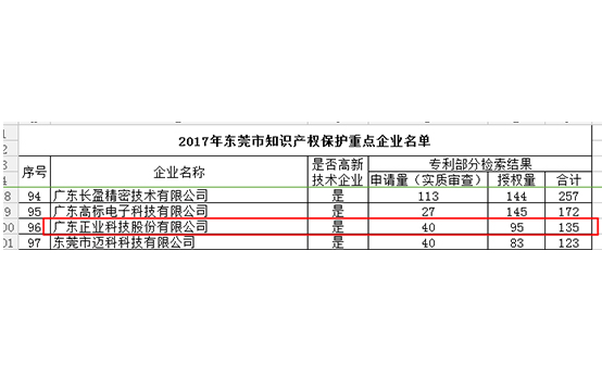2017年6月,經東莞市科學技術局審核篩選,廣東正業科技股份有限公司(股票代碼:300410)入選“2017年東莞市知識產權保護重點企業”。