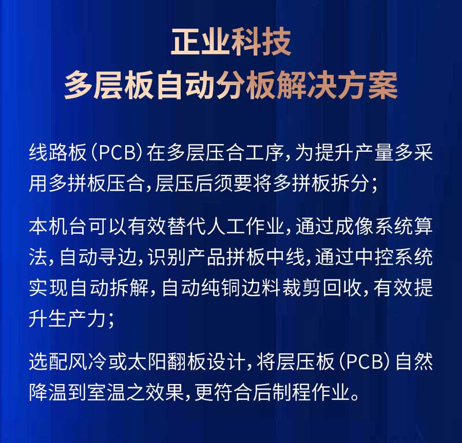 當(dāng)前位置:首頁(yè)>產(chǎn)品中心>解決方案>PCB行業(yè)>正業(yè)科技解鎖PCB生產(chǎn)新模式,高效分板線助力產(chǎn)業(yè)升級(jí)